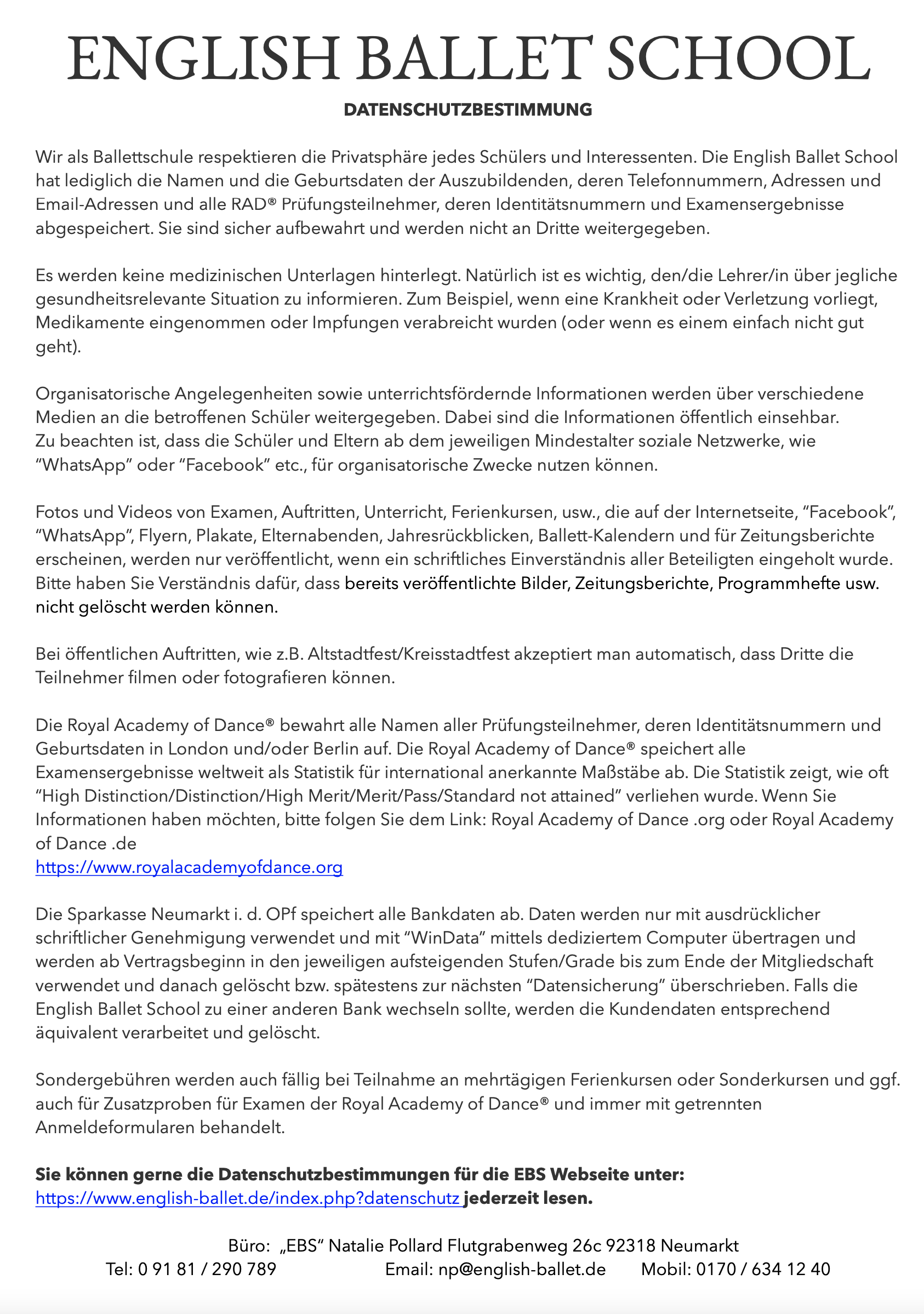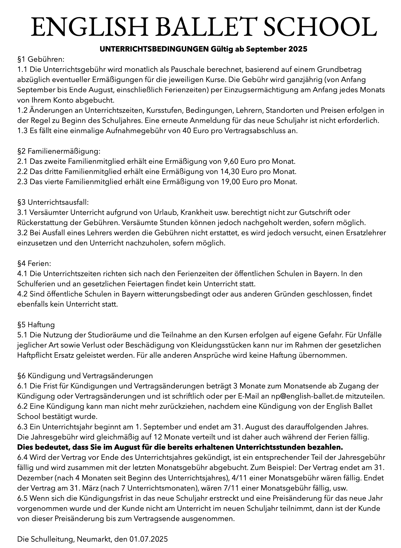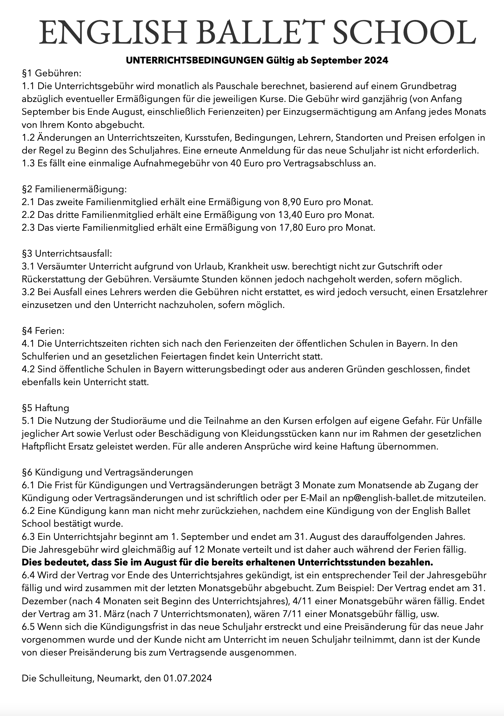 Für die English Ballet School gilt die Ferienordnung der öffentlichen Schulen in Bayern.